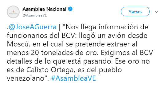 «Из Москвы прибыл самолет, на котором собираются вывезти не менее 20 тонн золота. Мы требуем от банка объяснений по поводу того, что происходит. Это золото не Каликсто Ортеги (главы Банка Венесуэлы — ред.), а венесуэльского народа», — говорится в сообщении.