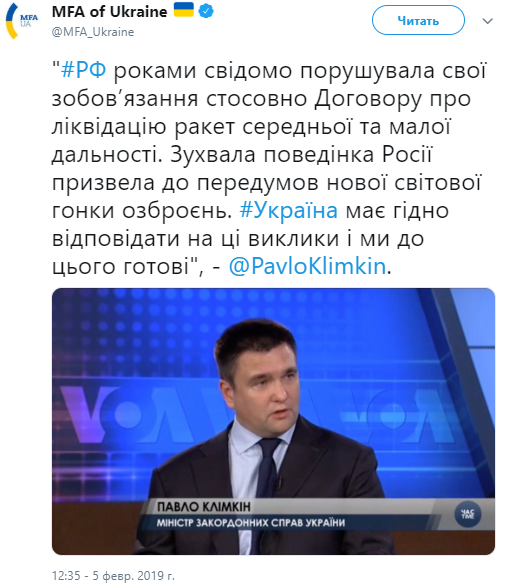 «Это поведение России привело к новой логике гонки вооружений. Конечно, другие партнеры также будут это (размещение ракет средней и малой дальности) делать», — сказал Климкин.