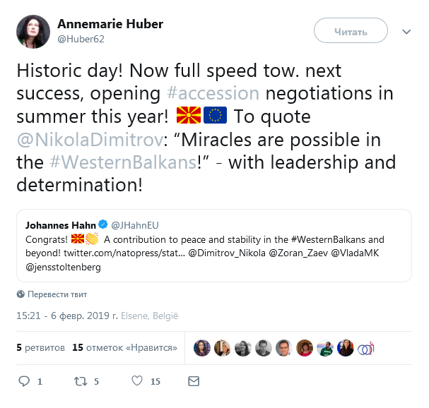 Хубер также процитировала македонского министра иностранных дел Николу Димитрова, который сказал, что «на Западных Балканах возможны чудеса».