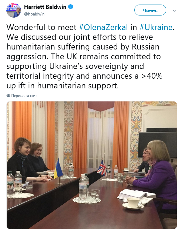 «Встретилась в Украине с заместителем министра иностранных дел Украины по вопросам европейской интеграции Еленой Зеркаль и обсудила с ней совместные усилия по уменьшению негативных последствий российской агрессии на востоке страны. Великобритания по-прежнему поддерживает суверенитет и территориальную целостность Украины и объявляет об увеличении гуманитарной поддержки более, чем на 40%», — написала она.