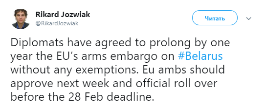 «Дипломаты согласились продлить на год эмбарго ЕС на поставки оружия Беларуси без исключений. Послы ЕС примут решение на следующей неделе, а официальное продление эмбарго будет до 28 февраля», — написал он.