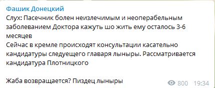 «Сейчас в Кремле происходят консультации касательно кандидатуры следующего главаря «ЛНР». Рассматривается кандидатура Игоря Плотницкого. Жаба возвращается? П***ец «ЛНР»», — говорится в сообщении.