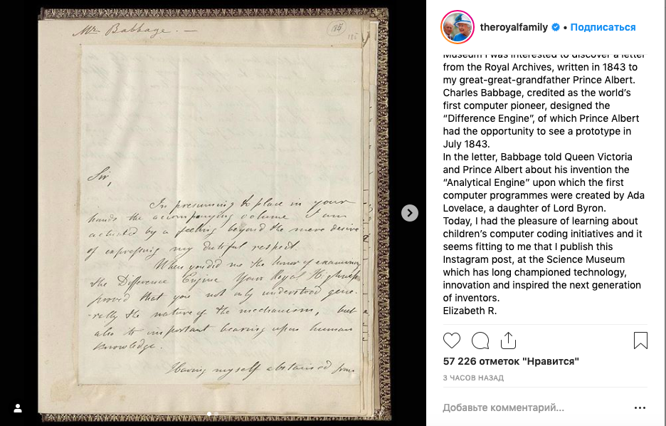 Королева сделала публикацию в четверг, 7 марта, после посещения лондонского Музея науки. Она опубликовала фотокопию письма, написанного в 1843 году ее прапрадеду принцу Альберту от Чарльза Бэббиджа, который стоял у истоков создания первого в мире компьютера.