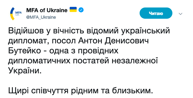 «Отошел в вечность известный украинский дипломат, посол Антон Денисович Бутейко — одна из ведущих дипломатических личностей независимой Украины. Искренние соболезнования родным и близким», — говорится в сообщении.