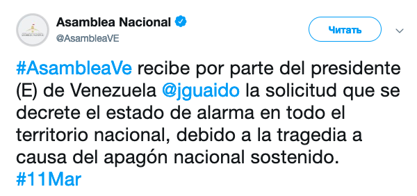 «Исполняющий обязанности президента Хуан Гуайдо направил в Национальную ассамблею республики запрос о введении в стране режима чрезвычайного положения сроком на 30 дней из-за катастрофы, связанной с перебоями в электроснабжении», — говорится в сообщении.
