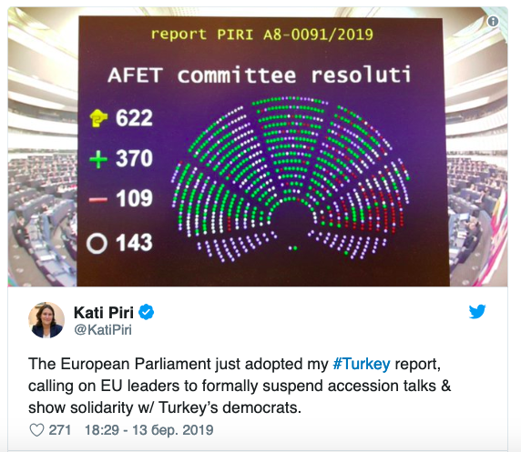 «Европейский парламент только что принял мой отчет о Турции, призвав лидеров ЕС официально прекратить переговоры о присоединении и показать солидарность с турецкими демократами», — написала она.