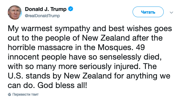 «Я выражаю самые теплые соболезнования и наилучшие пожелания народу Новой Зеландии после ужасной резни в мечетях. 49 невинных людей так нелепо погибли, а многие получили серьезные ранения. США поддерживают Новую Зеландию во всем, что мы можем сделать. Боже, благослови всех!» — написал Трамп.
