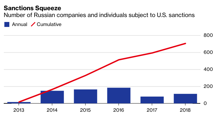 По данным Bloomberg Economics, за пять лет аннексии Крыма экономика России уменьшилась более чем на 10% — или на $150 млрд — по сравнению с 2013 годом. Это связано с падением цен на нефть и введением санкций против России.