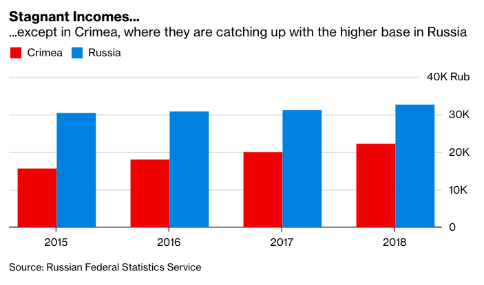 «Экономическое затишье означает, что меньше денег попадает в карман простых россиян: с момента оккупации Крыма и в результате снижения цен на нефть страна около двух лет находится в рецессии, средние доходы населения едва превышают 30 000 рублей в месяц ($459). Крым является одним из регионов, где доходы выросли, т.к. доходы населения увеличиваются с низкой базы, стремясь сравняться со средней зарплатой по России», — сообщает Bloomberg.