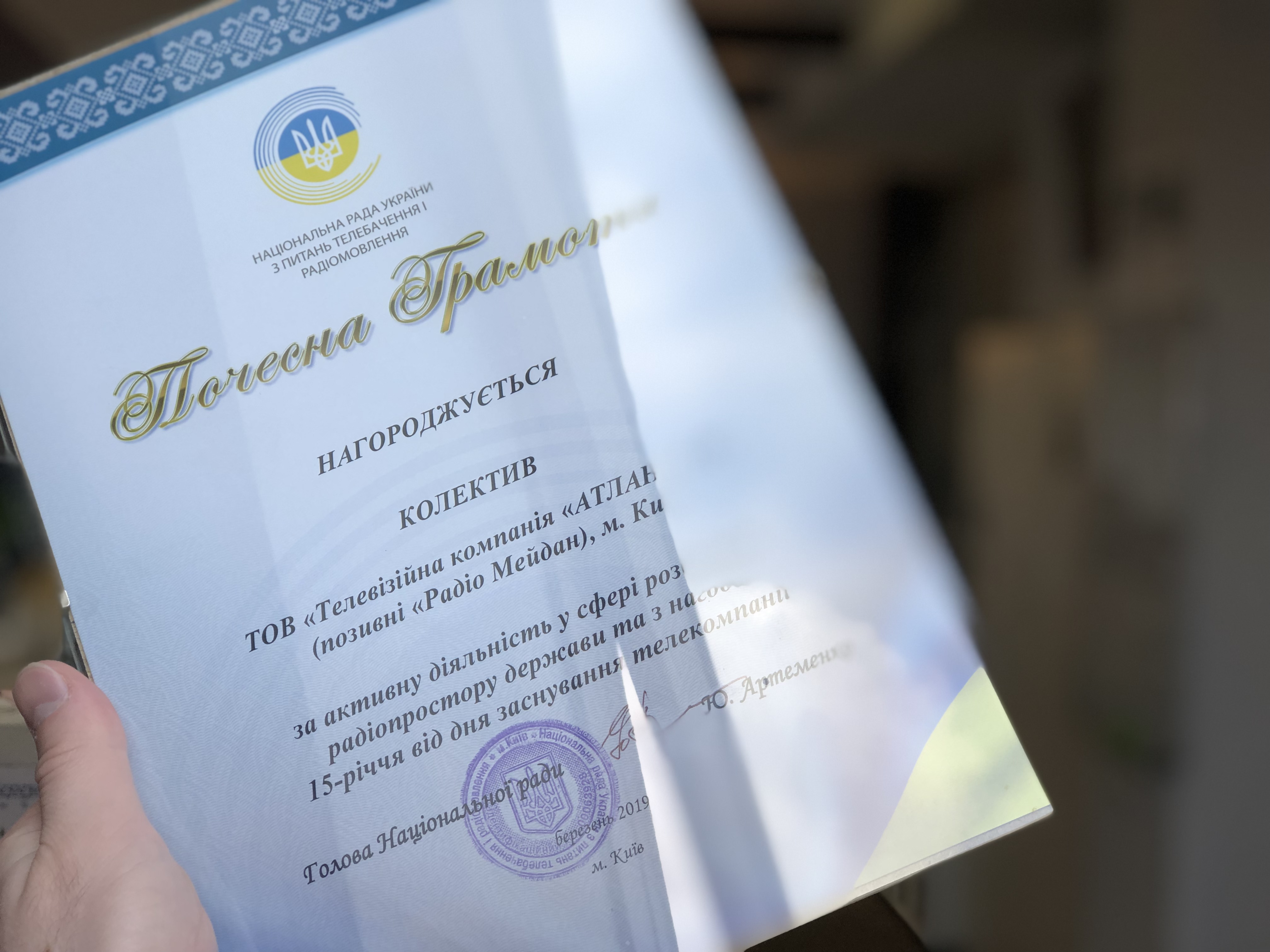 «Награждается коллектив ООО «Телевізійна компанія «Атлант-СВ» (позивные «Радіо Мейдан»), г. Киев, за активную деятельность в сфере развития радиопространства государства и по случаю 15-летия со дня основания телекомпании», — говорится в документе.