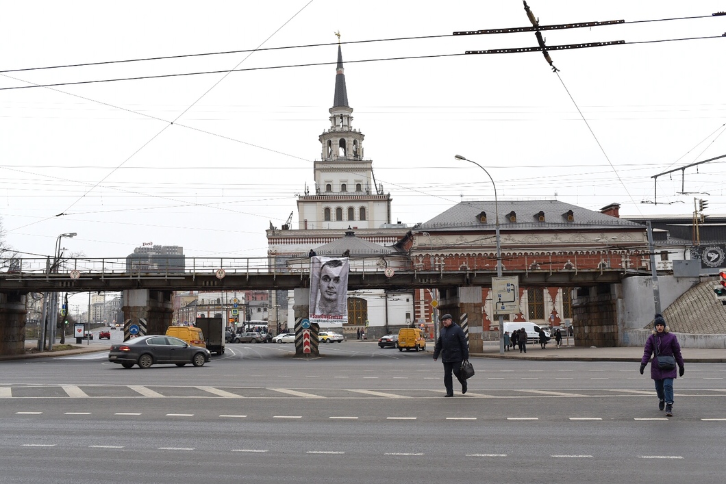 Российские активисты 22 марта вывесили трехметровый баннер с изображением украинского режиссера Олега Сенцова у здания Казанского вокзала в Москве.