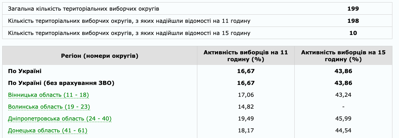 Наибольшее количество избирателей зафиксировано в Днепропетровской области — 45,99%, наименьшее — во Львовской (34,18%).