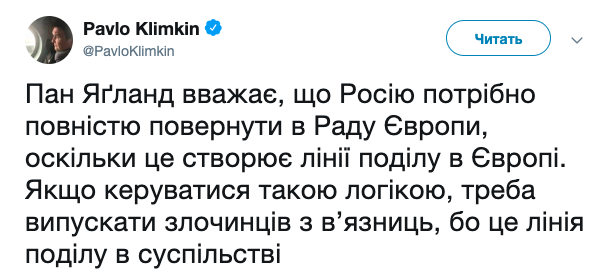 «Господин Ягланд считает, что Россию нужно полностью вернуть в Совет Европы, поскольку это создает линию разделения в Европе. Если руководствоваться такой логикой, нужно выпускать преступников из тюрем, потому что это линия разделения в обществе», — написал Климкин на своей странице в Twitter.