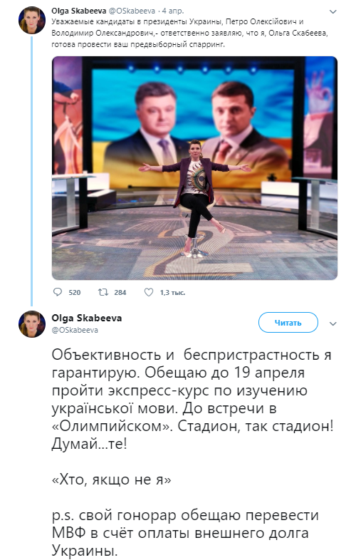 «Объективность и беспристрастность я гарантирую. Обещаю до 19 апреля пройти экспресс-курс по изучению української мови. До встречи в «Олимпийском». Стадион, так стадион! Думай…те», — написала в своем Twitter Ольга Скабеева.