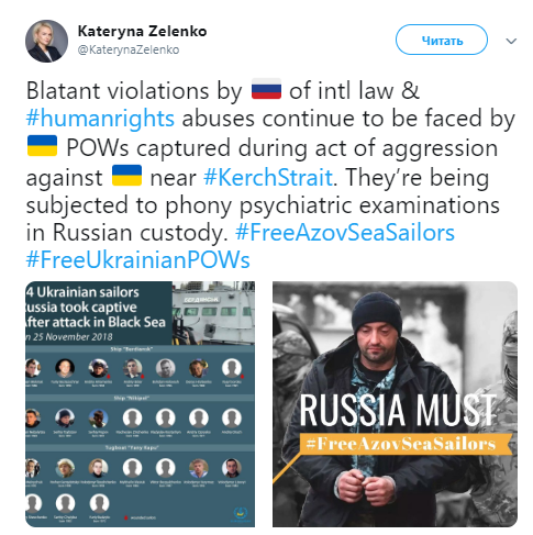 «Вопиющие нарушения международного закона и прав человека продолжает совершать Россия по отношению к украинским военнопленным морякам, захваченных в Керченском проливе. Они подвергаются фальшивым психиатрическим обследованием, будучи заключенными в России», — написала она.