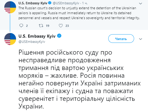 «Решение российского суда о несправедливом продолжении содержания под стражей украинских моряков — ужасное. Россия должна немедленно вернуть Украине задержанных членов ее экипажа и судна и уважать суверенитет и территориальную целостность Украины», — подчеркивается в сообщении.