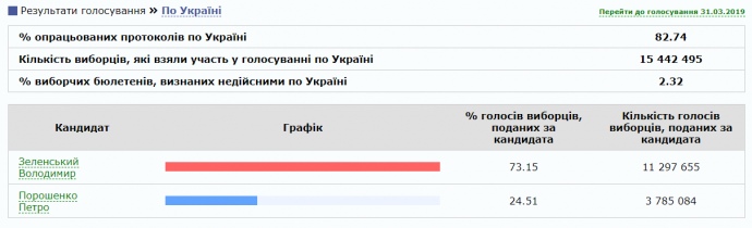 Центральная избирательная комиссия обработала 82,74% электронных протоколов второго тура выборов президента Украины. Владимир Зеленский набирает 73,15% голосов, Петр Порошенко — 24,51%.