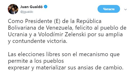 «Как исполняющий обязанности президента Боливарианской Республики Венесуэла, я поздравляю народ Украины и Владимира Зеленского с их широкой и громкой победой. Свободные выборы — это механизм, который позволяет народам выразить и материализовать ваше желание перемен», — написал Гуайдо.
