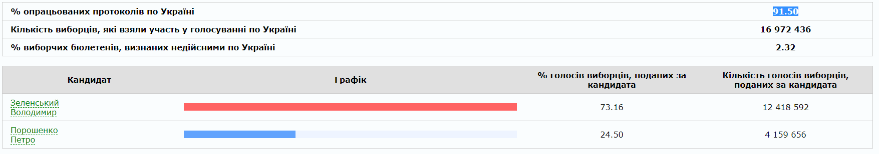 Центральная избирательная комиссия обработала 91,50% электронных протоколов второго тура выборов президента Украины. Владимир Зеленский набирает 73,16% голосов, Петр Порошенко — 24,50%.