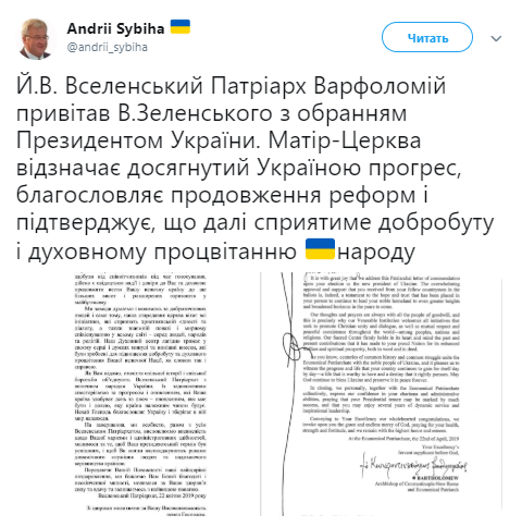 Вселенский Патриарх Варфоломей поздравил Владимира Зеленского с победой на выборах президента Украины.