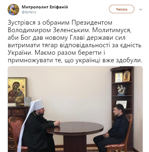 На своей странице в Twitter Епифаний опубликовал совместную с Зеленским фотографию и отметил, что будет молиться, чтобы Бог дал новому президенту сил «выдержать бремя ответственности за единство Украины».