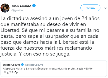 «Диктаторский режим убил 24-летнего мужчину, который хотел жить в свободе. Я знаю, что моих соболезнований вашей семье недостаточно, но узурпатор знает, что на каждом шагу есть сила наших мучеников, которые требуют справедливости», — написал Гуайдо.