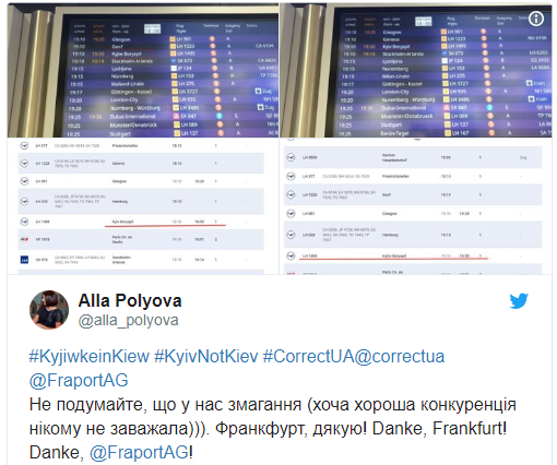 Международный аэропорт во Франкфурте-на-Майне начал использовать название Киева латиницей согласно украинской транслитерации.