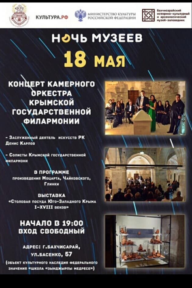 «Концерт Камерного оркестра Крымской государственной филармонии и выставка «Столовая посуда Юго-Западного Крыма I-XVIII веков», запланированные на 19 мая 2019 года в рамках всероссийской акции «Ночь музеев», отменяются по техническим причинам», — говорится в заявлении на сайте.