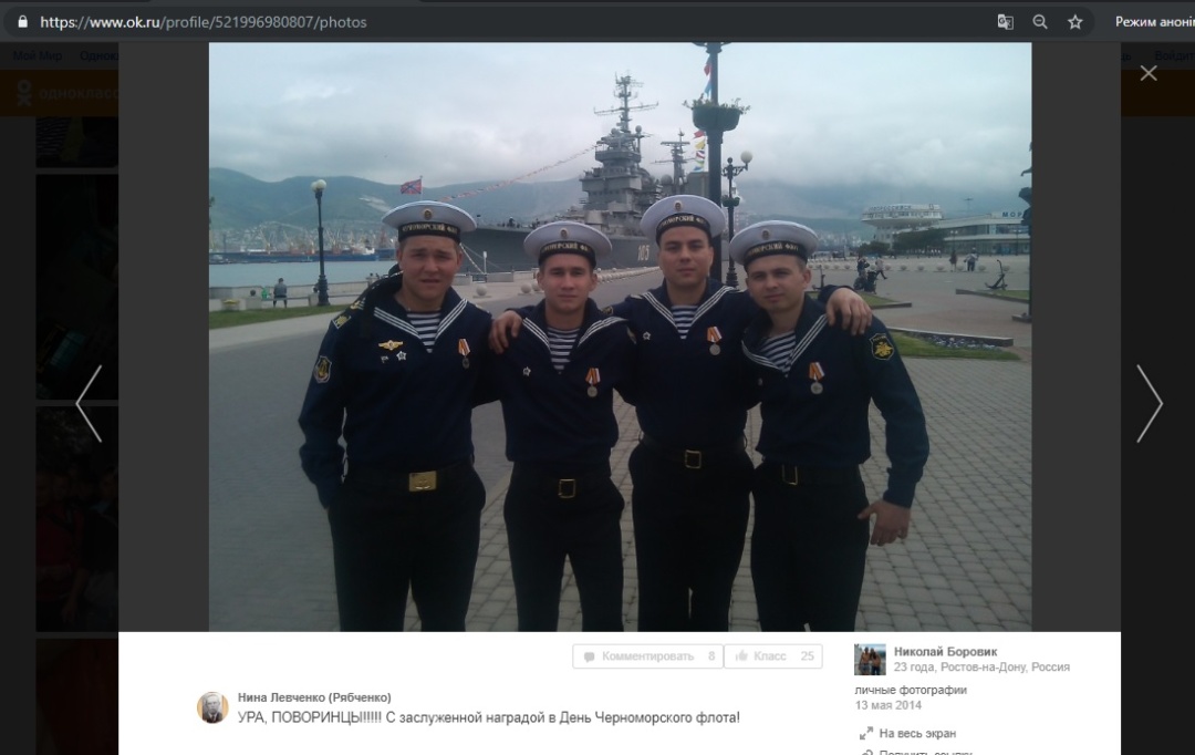 Кроме того, в соцсетях Николая Боровика есть такая же групповая фотография моряков с корабля «Поворино» с медалями «За «возвращение» Крыма».