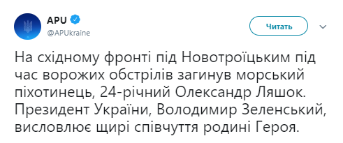 «На восточном фронте под Новотроицким во время вражеских обстрелов погиб морской пехотинец, 24-летний Александр Ляшок. Президент Украины Владимир Зеленский выражает искренние соболезнования семье героя», — отметили в АП.
