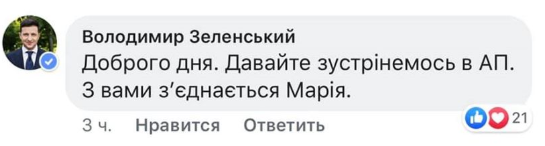 «Добрый день. Давайте встретимся в АП. С вами свяжется Мария», — написал президент.