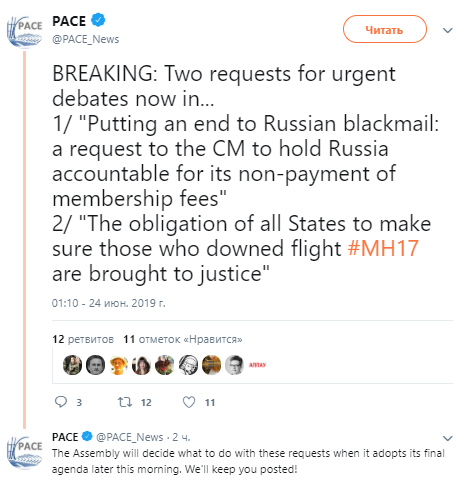 Об этом сообщает пресс-служба ПАСЕ в Twitter.