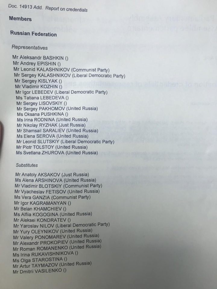 Также в список делегации РФ в ПАСЕ вошли: вице-спикеры Госдумы Петр Толстой и Игорь Лебедев, глава комитета Госдумы по делам СНГ Леонид Калашников, глава международного комитета Госдумы Леонид Слуцкий, депутаты Светлана Журова, Сергей Пахомов, Оксана Пушкина, Ирина Роднина, Николай Рыжак, Шамсаил Саралиев, Елена Серова, первый замглавы международного комитета Совета Федерации, бывший посол РФ в США Сергей Кисляк, сенаторы Андрей Епишин, Сергей Калашников, Владимир Кожин, Татьяна Лебедева и Сергей Лисовский.