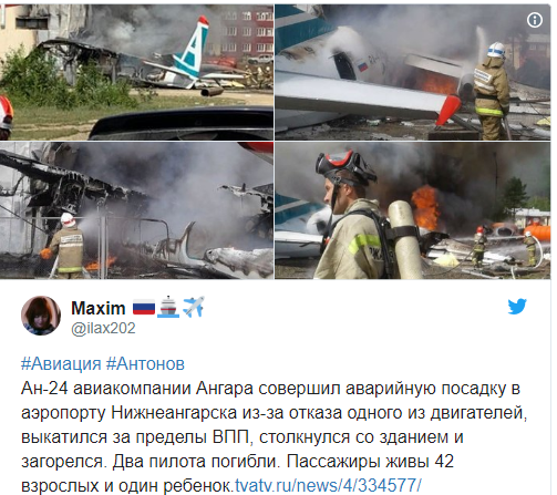 Сообщается, что 27 июня пассажирский Ан-24 авиакомпании «Ангара» вылетел из Нижнеангарска в Улан-Удэ. Уже в воздухе отказал один из двигателей, экипаж принял решение о возвращении в аэропорт вылета. Во время посадки из-за невозможности осуществления реверса по причине отказа двигателя борт выехал на 100 метров за пределы взлетно-посадочной полосы и столкнулся со зданием очистных сооружений. После столкновения самолет загорелся. К настоящему времени пожар потушен.