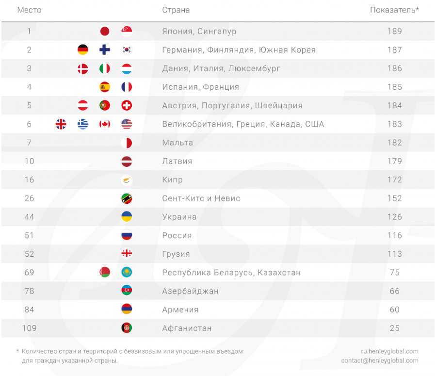 Напомним, Индекс паспортов компании Henley & Partners — это международный рейтинг стран по уровню свободы передвижения, которую они предоставляют своим гражданам.