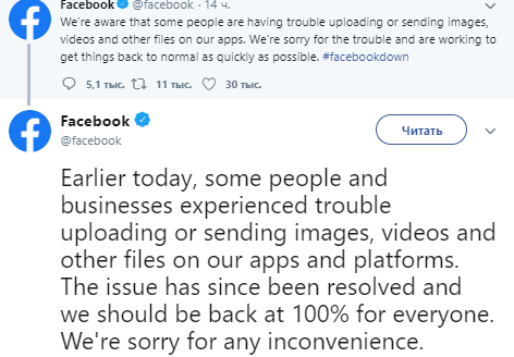 «Ранее некоторые люди и компании столкнулись с проблемами при загрузке или отправке изображений, видео и других файлов в наших приложениях. Эта проблема решена, мы должны были вернуться на 100% для всех», — сообщила команда Facebook.