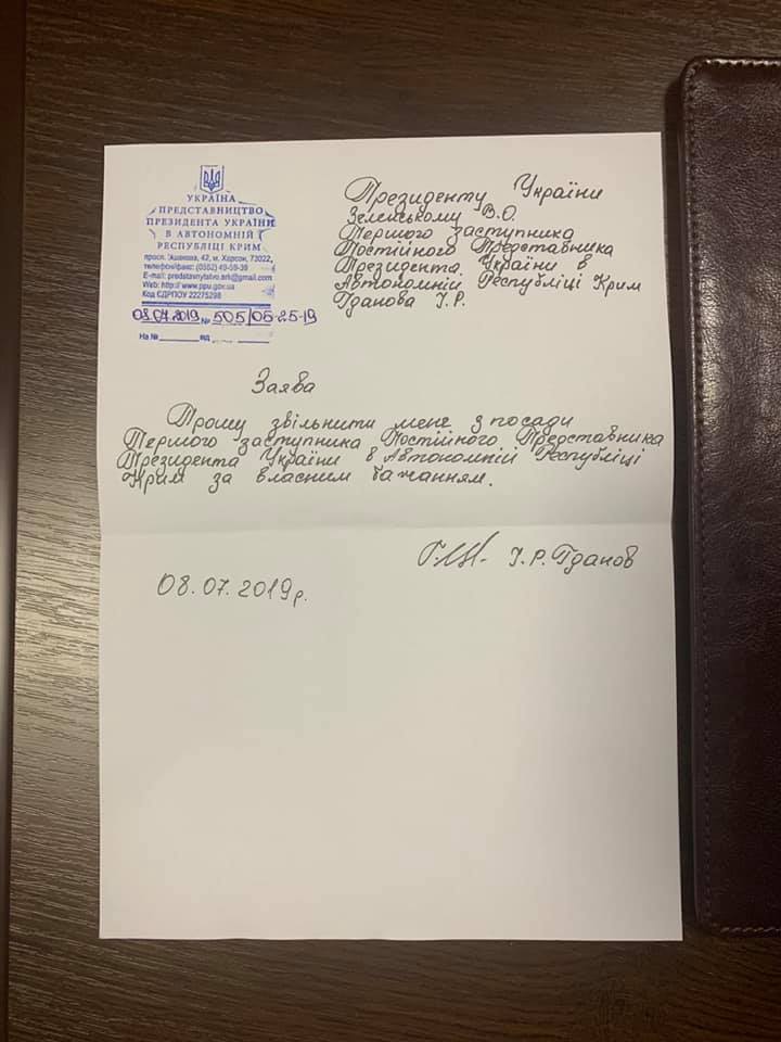 «Принял решение подать в отставку, но борьбу за возвращение в свободного от российских оккупантов Крыма не оставлю никогда! Работа Представительства под особым вниманием общественности была, есть и будет. Такие вопросы как недопущение до освобождения полуострова подачи воды, кутаранська дамба, сотрудничество с оккупантами в любом виде, санкции и многие другие будут на постоянном контроле, и механизмы реагирования у нас есть!» — написал Гданов, опубликовав фото своего заявления.
