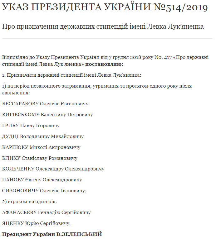 Так, на период незаконного задержания, содержания и в течение одного года после освобождения стипендии назначены: Алексею Бессарабову, Валентину Выговскому, Павлу Грибу, Владимиру Дудке, Николаю Карпюку, Станиславу Клыху, Александр Кольченко, Евгению Панову и Алексею Сизоновичу. Кроме того, президент назначил стипендии сроком на один год Геннадию Афанасьеву и Юрию Яценко, которые ранее были освобождены из российских тюрем.