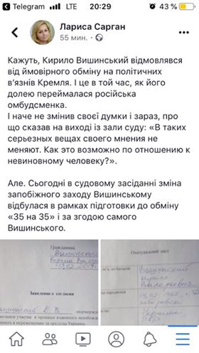 «Говорят, Кирилл Вышинский отказывался от возможного обмена на политических заключенных Кремля. И это в то время, как его судьбой занималась российская омбудсмен. И якобы не изменил своего мнения и сейчас, о чем сказал на выходе из зала суда. <...> Но. Сегодня (28 августа — ред.) в судебном заседании изменение меры пресечения Вышинскому состоялась в рамках подготовки к обмену «35 на 35» и с согласия самого Вышинского», — отметила Сарган.