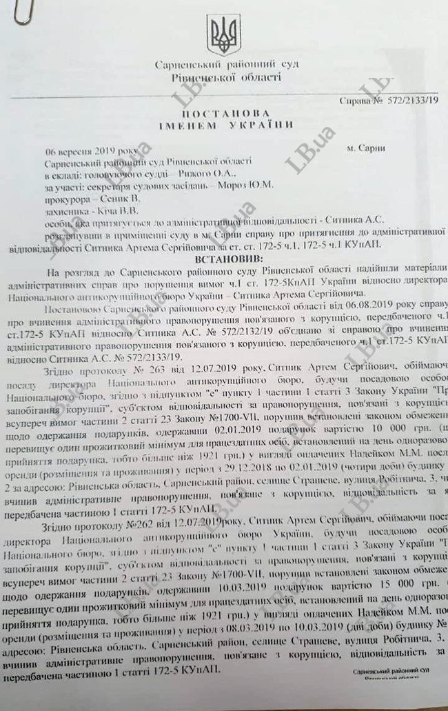 Сарненский районный суд признал директора НАБУ Артема Сытника виновным в административном нарушении во время отдыха в Ровенской области и присудил штраф.