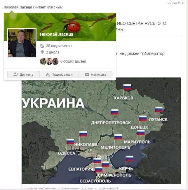 «Учитель в запрещенной социальной сети постил сообщения антиукраинского характера. Начиная с главаря «ДНР» Захарченко и заканчивая тем, что Одесса — это Россия, в сопровождении запрещенной георгиевской ленты. <...> Учителя уволили из школы, ведь недопустимо, чтобы человек с такими взглядами работал в сфере образования», — говорится в его сообщении.