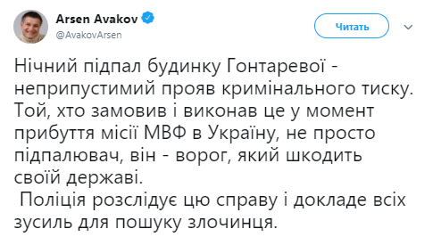 «Ночной поджог дома Гонтаревой — недопустимое проявление криминального давления. Тот, кто заказал и исполнил это в момент прибытия миссии МВФ в Украину, не просто поджигатель, он — враг, который вредит своему государству. Полиция расследует это дело и приложит все усилия для поиска преступника», — написал Аваков в своем микроблоге в Twitter.