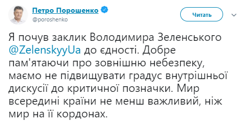 «Я услышал призыв Владимира Зеленского к единству. Хорошо помня о внешней опасности, мы не должны повышать градус внутренней дискуссии до критической отметки. Мир внутри страны не менее важен, чем мир на ее границах», — написал он.