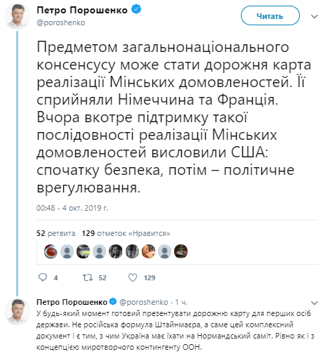 Кроме того, Порошенко отметил, что Украина должна объединиться вокруг дорожной карты реализации Минских договоренностей, которую восприняли Германия и Франция и которую поддержали в США. В частности, Порошенко подчеркнул, что в первую очередь должен быть реализован блок о безопасности, и только после этого — политическая часть.