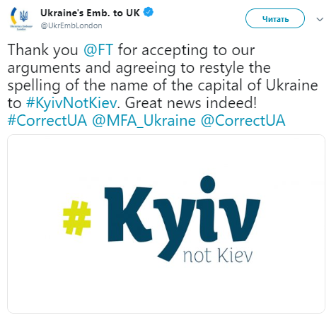 Напомним, МИД Украины совместно с Центром стратегических коммуникаций StratCom Ukraine в октябре 2018 года начали онлайн-кампанию #CorrectUA, в рамках которой планируется обращаться к иностранным СМИ с целью корректировки правописания названия столицы — #KyivNotKiev.