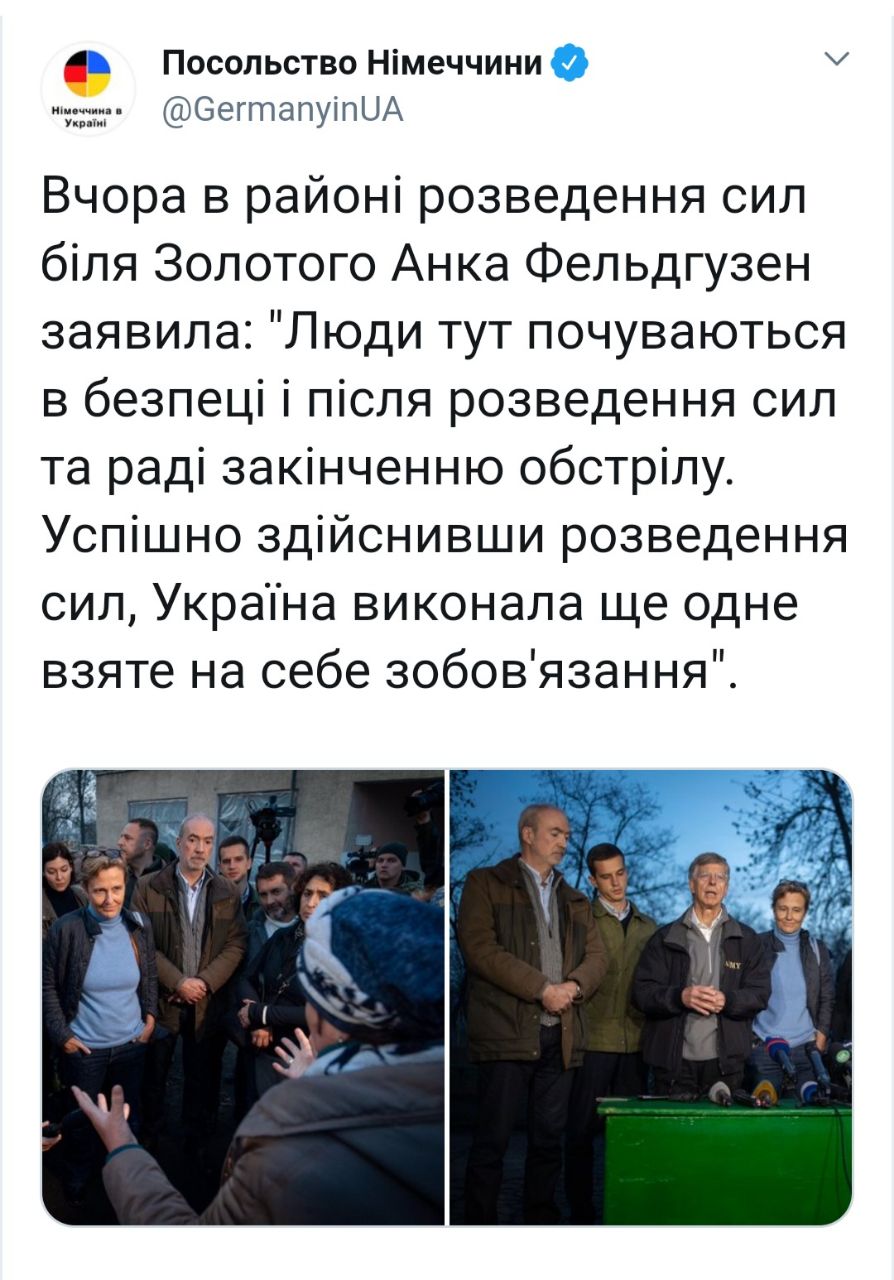Фельдгузен посетила участок разведения сил возле Золотого. Во время брифинга посол Германии в Украине отметила, что местные жители чувствуют себя в безопасности после разведения сил.