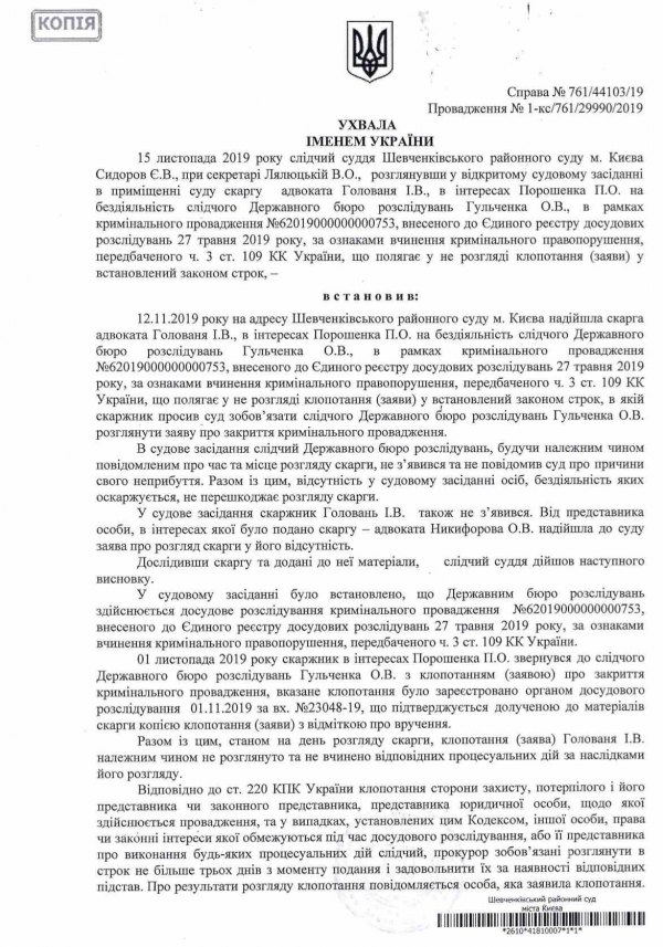 Головань отметил, что 15 ноября Шевченковский районный суд Киева обязал ГБР рассмотреть ходатайство о закрытии производства, по которому подготовлено подозрение.