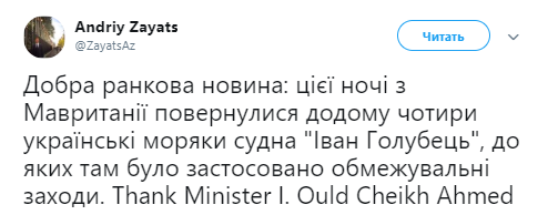 «Добрая утренняя новость: этой ночью из Мавритании вернулись домой четыре украинских моряка судна «Иван Голубец», к которым там были применены ограничительные меры», — написал Заяц.