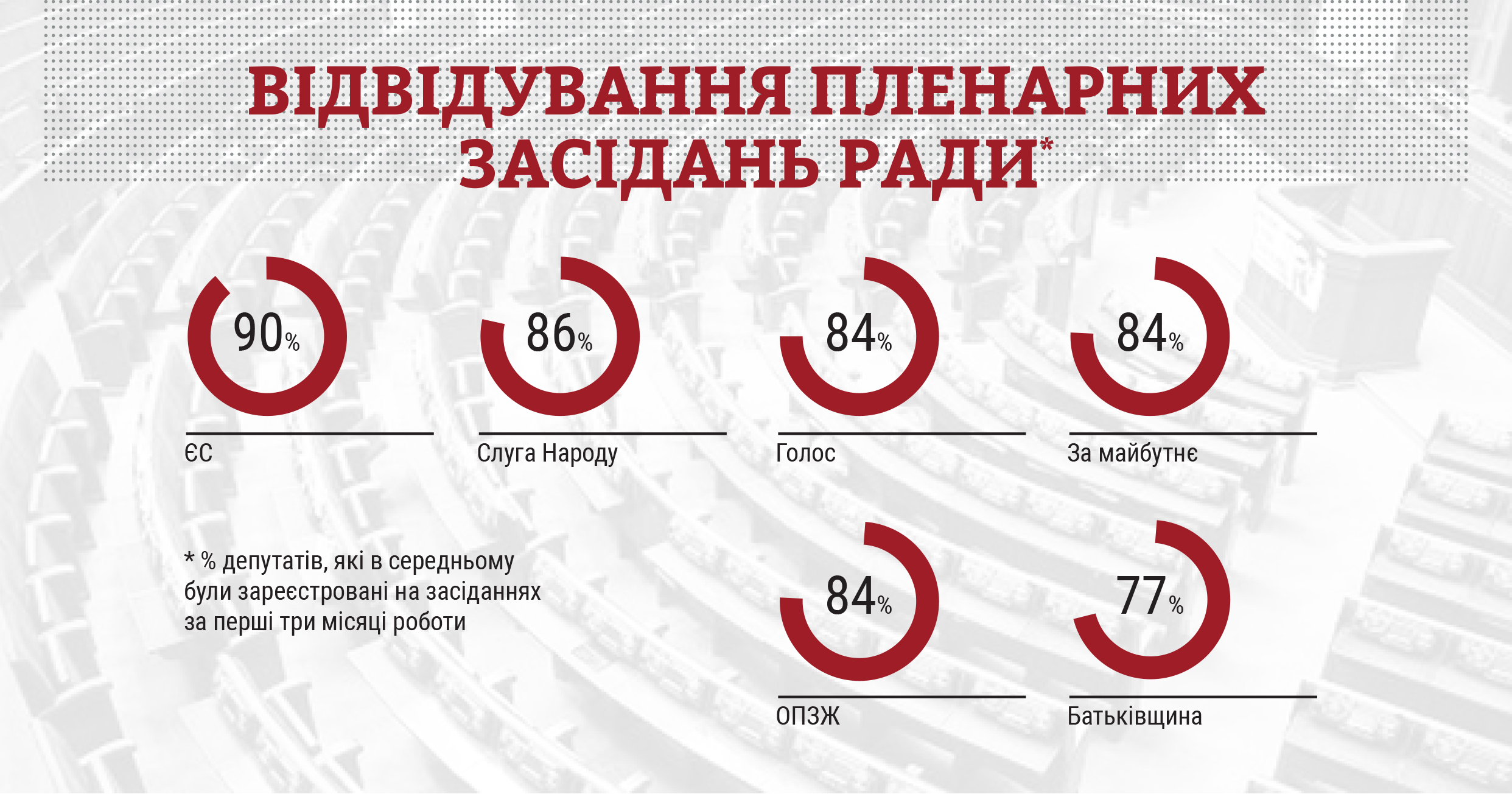 В среднем на пленарных заседаниях Верховной Рады регистрировались 361 из 423 народных депутатов. Лидерами по посещаемости заседаний стали нардепы от фракции «Европейская солидарность». От «Европейской солидарности» в среднем на заседаниях регистрировались 90% депутатов. От фракции «Слуга народа» — 86% депутатов. Из «Голоса», «Оппозиционной платформы — За жизнь» и группы «За будущее» регистрировались по 84% народных избранников. Из ВО «Батьківщина» — 77% нардепов.