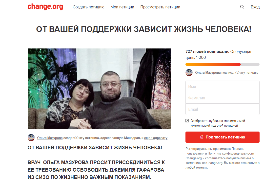 Автор петиции, опубликованной на сайте Сhange.org, врач из Москвы Ольга Мазурова. Она просит всех неравнодушных присоединиться к ее требованию освободить Джемиля Гафарова из СИЗО по жизненно важным показаниям.